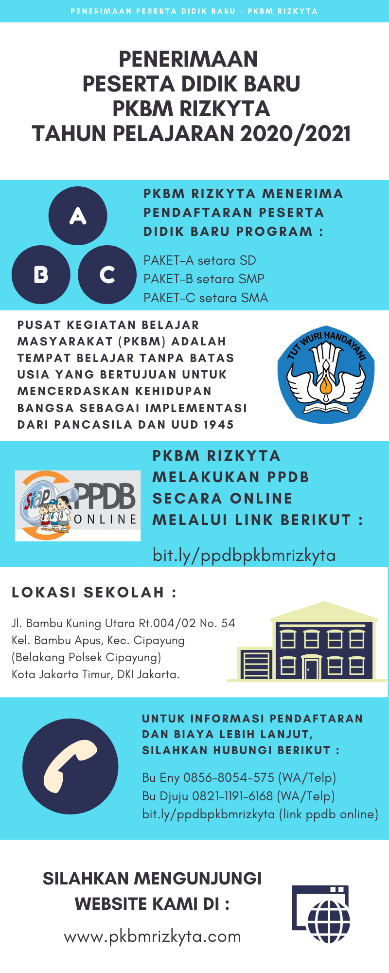 Untuk itu apabila ada peserta didik baru yang ingin mendaftar di PKBM Rizkyta untuk tahun pelajaran baru 2020/2021, dapat mengakses formulir pendaftaran secara online, yaitu bit.ly/ppdbpkbmrizkyta