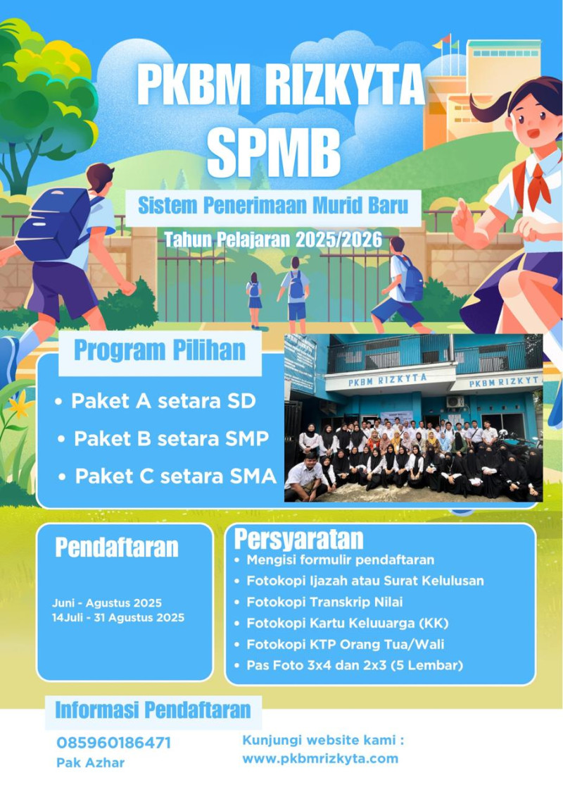 PKBM Rizkyta membuka Pendaftaran Peserta Didik Baru Tahun Pelajaran 2025-2026 secara Daring/Online serta dapat datang langsung ke sekolah.