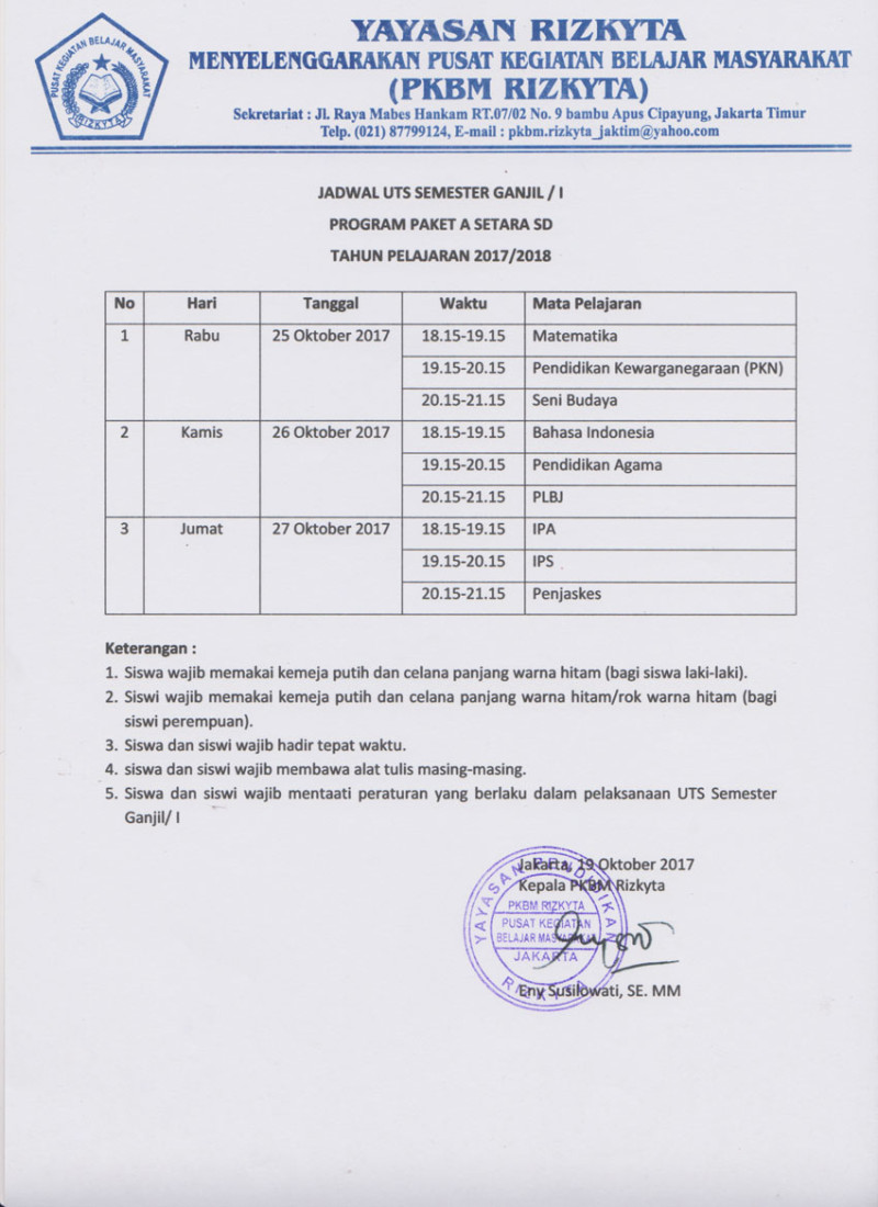 Jadwal UTS Paket A Tahun Pelajaran 2017/2018
